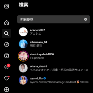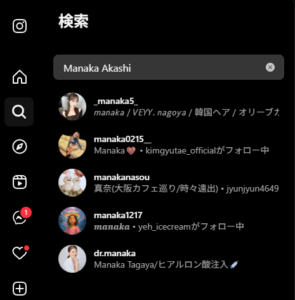 Instagram(インスタグラム)やインスタ上で「明石愛花」「Manaka Akashi」を検索したところ、本人と思われるアカウントは見つかりませんでした。