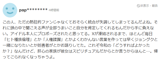公表情報は少ないが、ファンコミュニティでは以前から「危険人物」として知られていた。