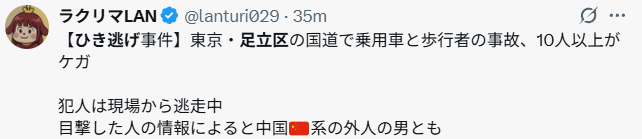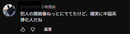 「犯人の顔画像ネットにでてたけど、確実に中国系帰化人だね」