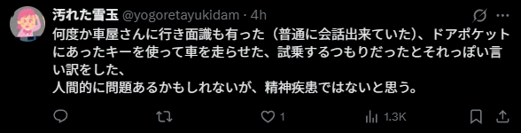 「普通に会話が出来ていて、ドアポケットにあったキーを使って車を走らせた。試乗するつもりだったとそれっぽい言い訳をした。人間的に問題あるかもしれないが、精神疾患ではないと思う。」