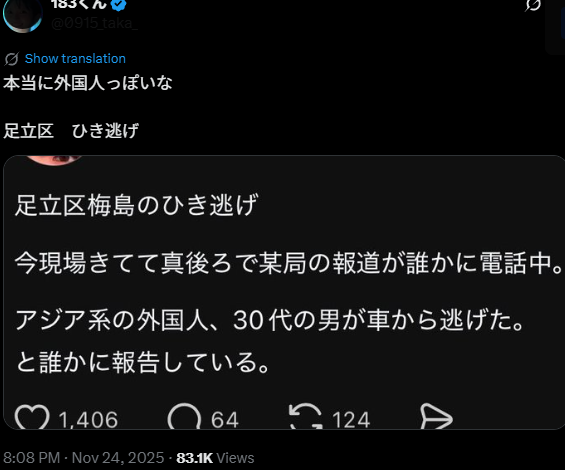 2025年11月24日、東京都足立区梅島で起きたひき逃げ事故について、ネット上では「容疑者の顔画像は?」「アジア系だったのでは?」といった関心が高まっています。