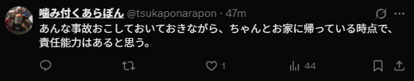 「あんな事故をおこしておきながら、ちゃんとお家に帰っている時点で、責任能力あると思う。」