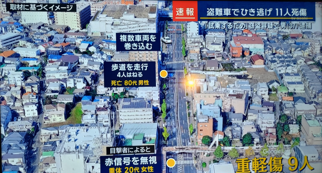 | 事故状況 | 白いクラウンが暴走 → 歩行者多数をはね → ガードレールに衝突 |